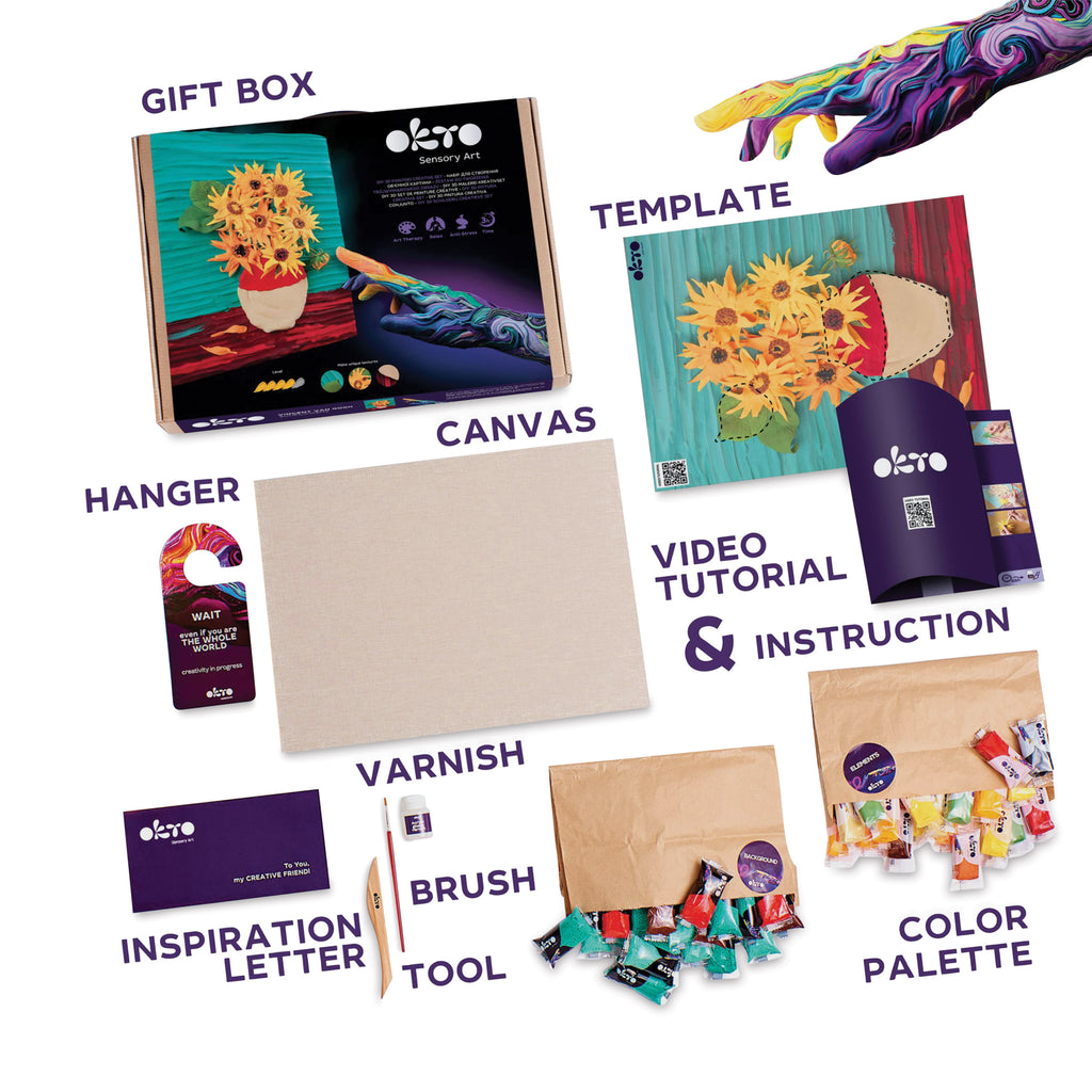 Sensory Art 3D Clay Painting Kits are a great alternative to traditional paint by numbers. These kits offer a new approach to creating unique artworks using light and soft modeling clay. Ideal for fostering imagination while providing a therapeutic outlet for stress relief. The clay is made up of safe components and natural materials. It is soft to the touch, easy to mix, and ensures lasting durability, maintaining its shape. With its residue-free formula, the clay does not leave traces on hands or hard surfaces. Each kit contains a natural cotton canvas that measures 15.7" x 11.8", a bag with multiple packages of colored air clay and air paste, a 20ml acrylic varnish bottle, a paint brush, a wooden modeling instrument made of natural oak, a "Do Not Disturb" door hanger, a step-by-step instructional booklet with a QR code to a video tutorial, and a colored template to help create shapes. Once dried, the finished masterpiece transforms into a charming home decoration, adding a touch of artistic flair to any space.