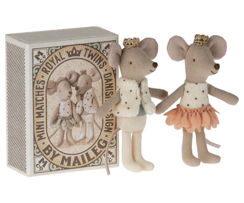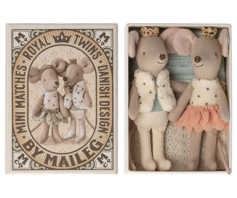 Make way for the royal heirs! This adorable duo’s outfits include complimenting accents, so they can always make a grand entrance together. They also share a customized matchbox that has their portraits printed on the top, how fancy! Our darling Royal Twins love to run around the castle together and play games. Little Sister likes to twirl and dance in her beautiful pedaled skirt. Little Brother looks so regal in his plush dotted vest and mint shaded shirt beneath it.