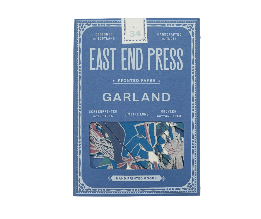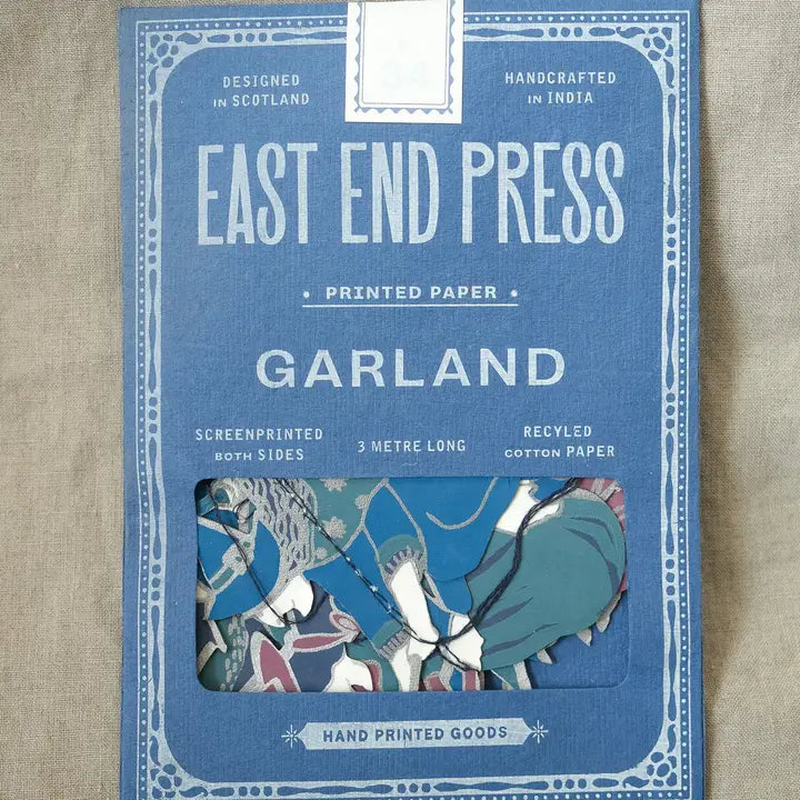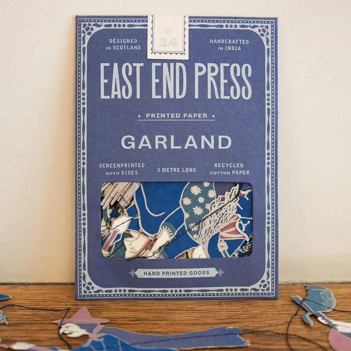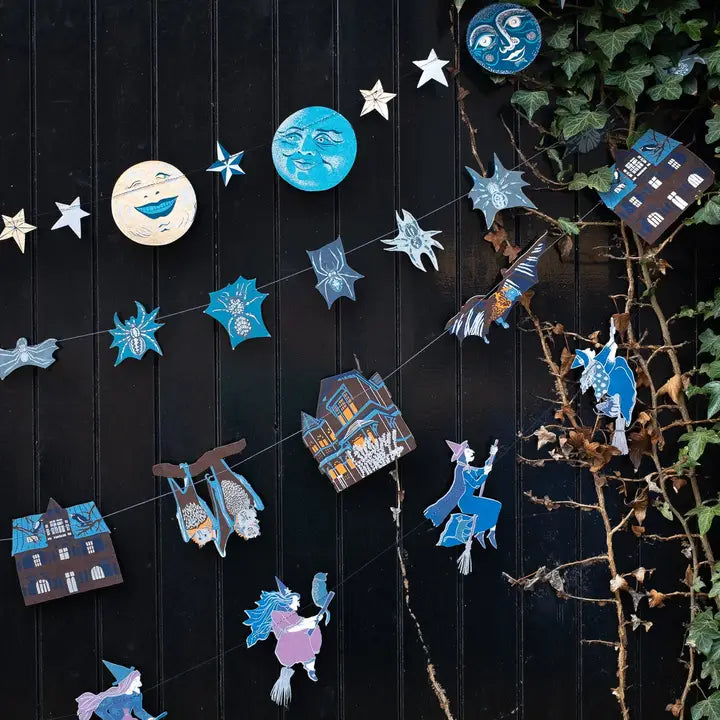 Fire burn and cauldron bubble as ten very wicked witches and their feline friends fly along the length of this three metre garland. Minimum order: 6 - 3 metres long - Includes 10 paper shapes, sewn along strong cotton thread - Screen printed by hand on both sides by talented artisans in Jaipur - Sustainably made from recycled materials