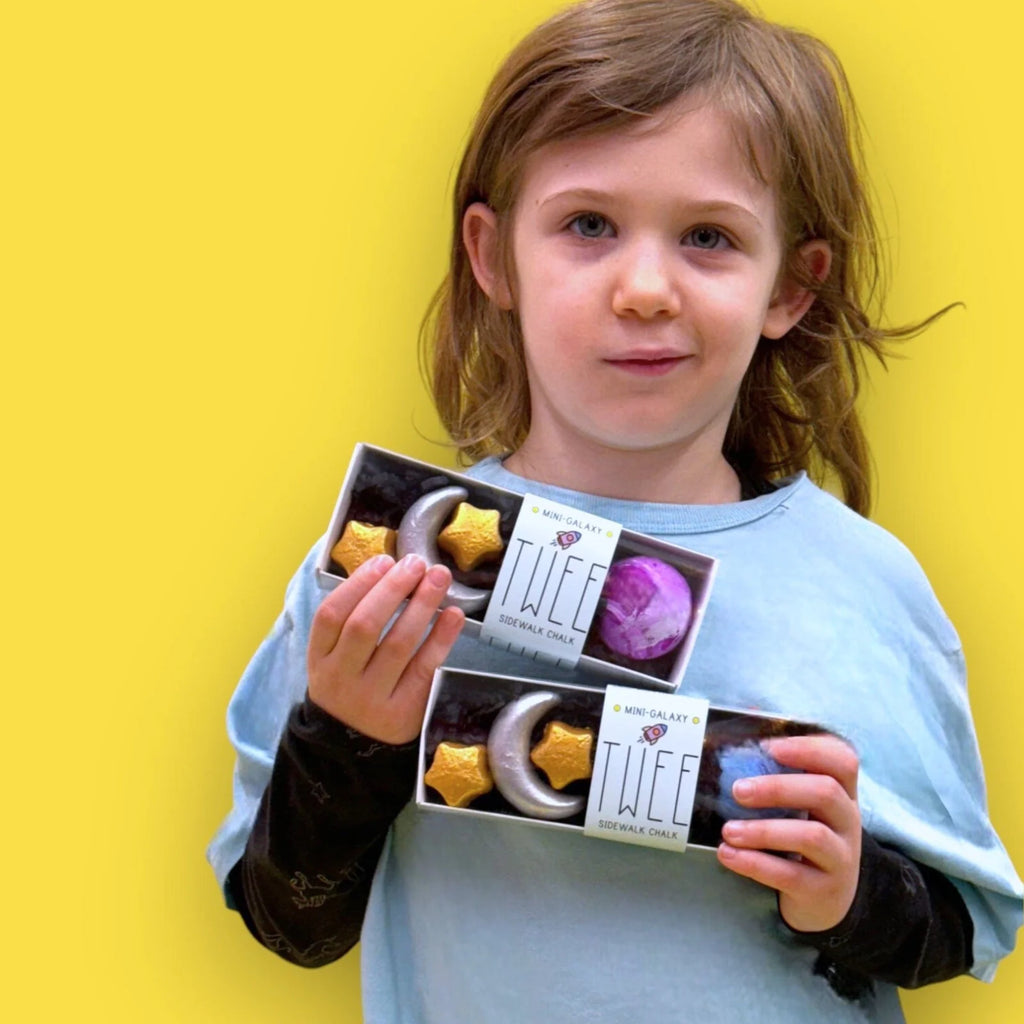 Snag a mini-version of our complete solar system, Mason's Planets, with a little added twinkle of two hand-painted gold stars and a silver crescent moon! Our TWEE Mini Galaxy handmade sidewalk chalk provides young astronomers the opportunity to explore the solar system through fun and imaginative play!