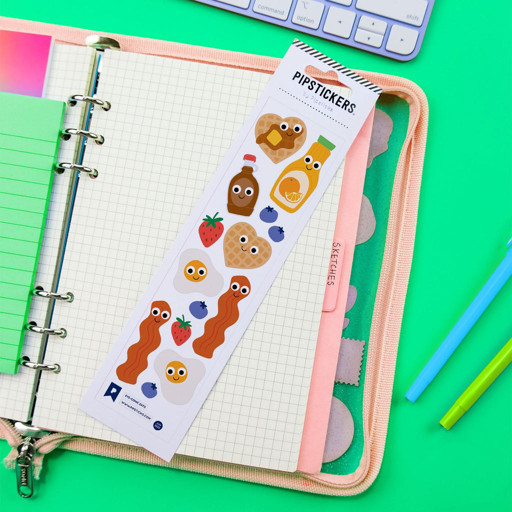 PipStickers are the perfect gift for the sticker lover in your life - even if it's you! These unique PVC designs with Googly Eyes come on a clear backing and cannot be found anywhere else. These playful PVC designs feature adorable googly eyes that wiggle with every move. Each sheet comes on a clear backing and can't be found anywhere else. Includes one 2" x 8" sheet of Googly Eyed Eye-conic Eats PipStickers and includes the Pipsticks manifesto.