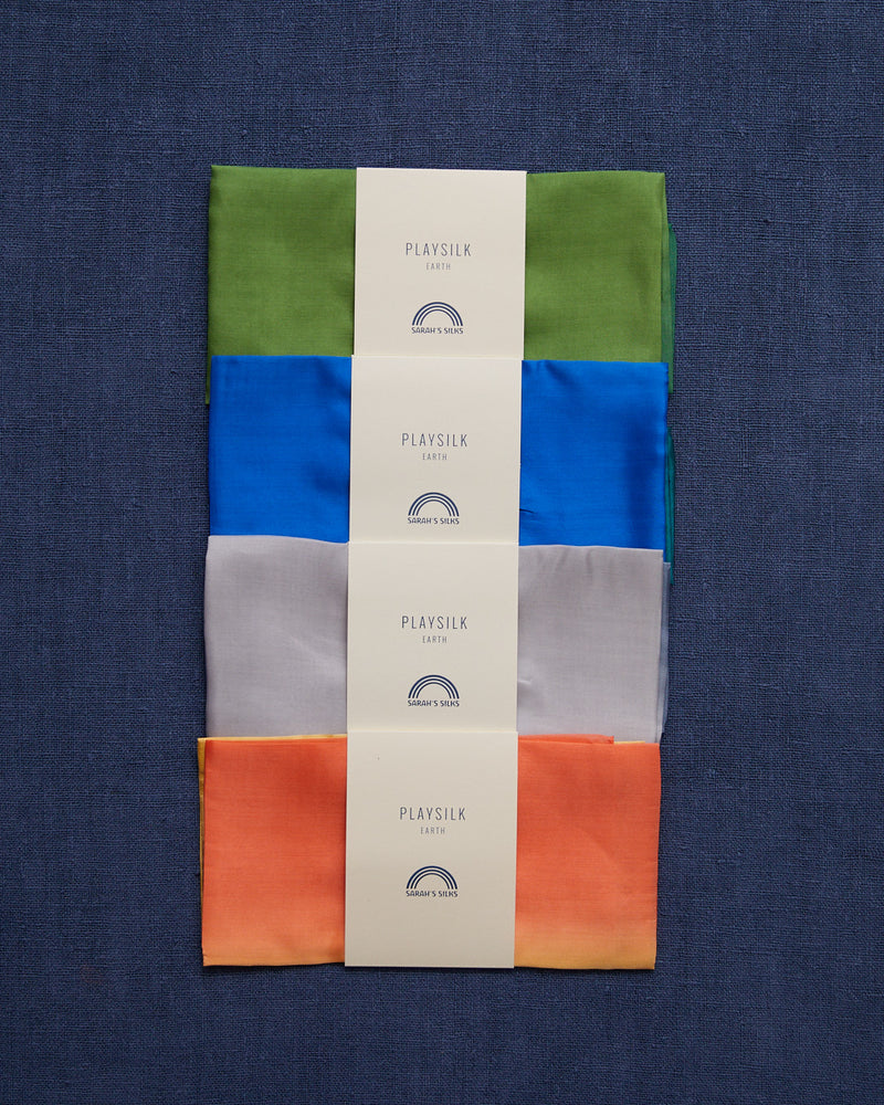 These playsilks were designed to inspire children to play in ways that care for Mother Earth. Beautifully blended colors on 35" x 35" square silk scarves. Children use them as the ocean for a sailboat, the sand on a beach, the forest for the trees, the stone for rock climbing, and so much more!