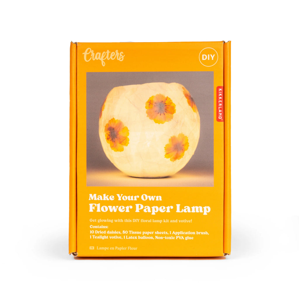 Make your own paper mâché lamp with real dried flowers and a reusable, electric tea light votive. Includes: tissue paper, water soluble, non-toxic PVA glue, application brush, latex balloon, 10 dried daisies, and 1 tealight votive with 50 hours battery power.