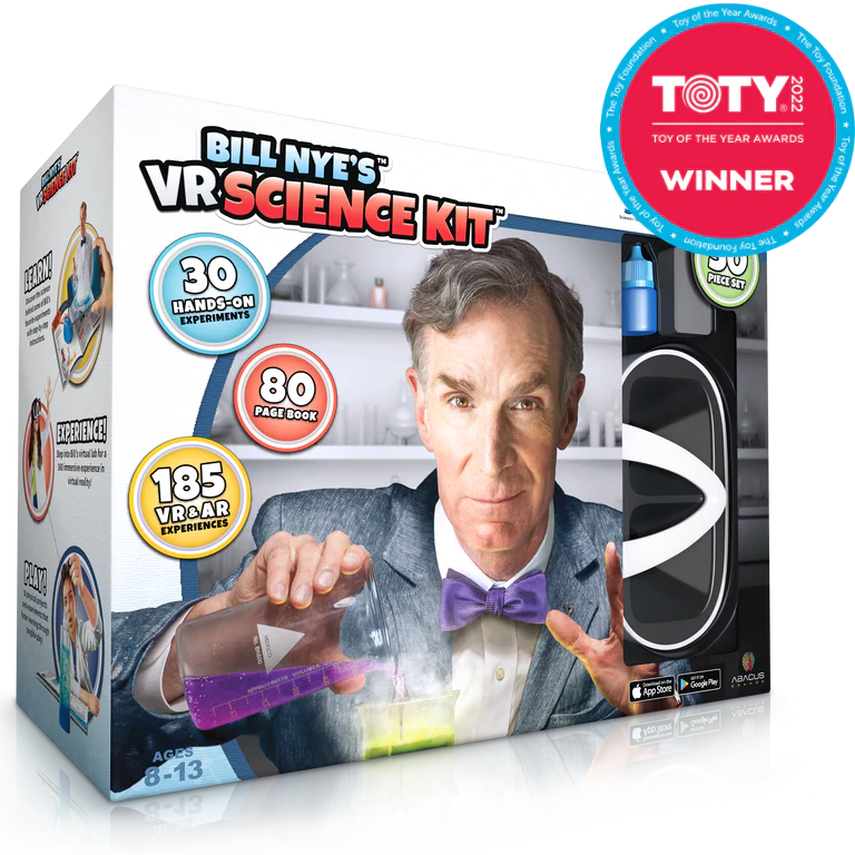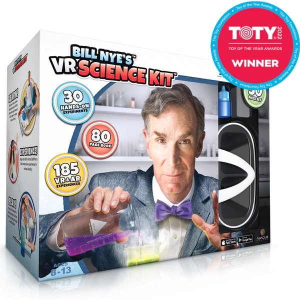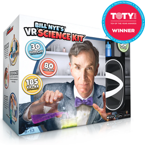 Explore science with Bill Nye "The Science Guy" in this interactive science kit for kids, complete with over 30 hands-on experiments! This kit includes an 80 page interactive book with step-by-step lessons in augmented reality, as pictures in the book turn into videos! Then, place your smart device into the included VR goggles and teleport to Bill's lab, in virtual reality! This 50 piece set includes materials to build a lava lamp, compass, rockets and more! Fly over volcanoes, dive into a crystal cave, ride a hot air balloon and more while discovering the wonders of science, with Bill Nye's VR Science kit!