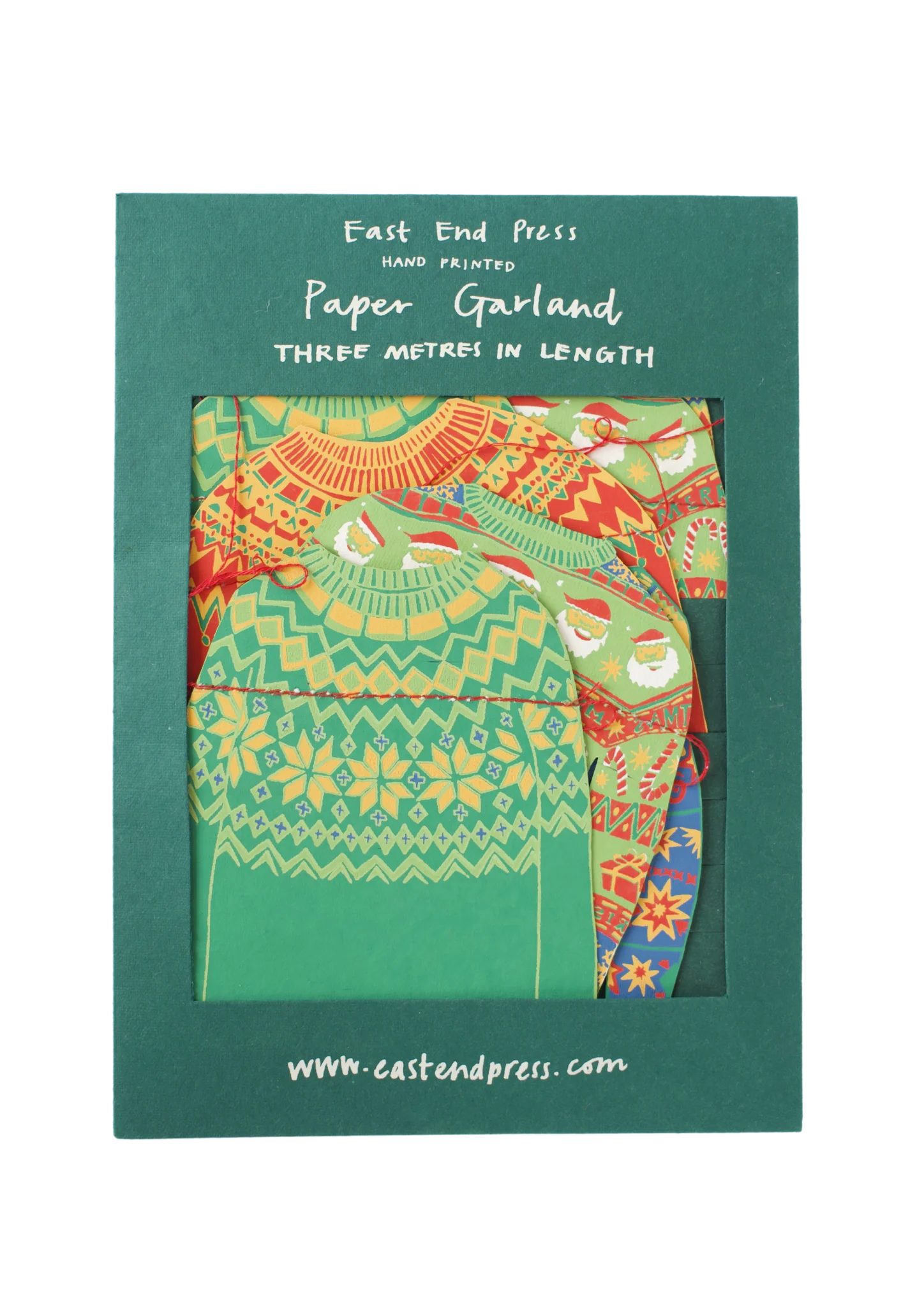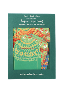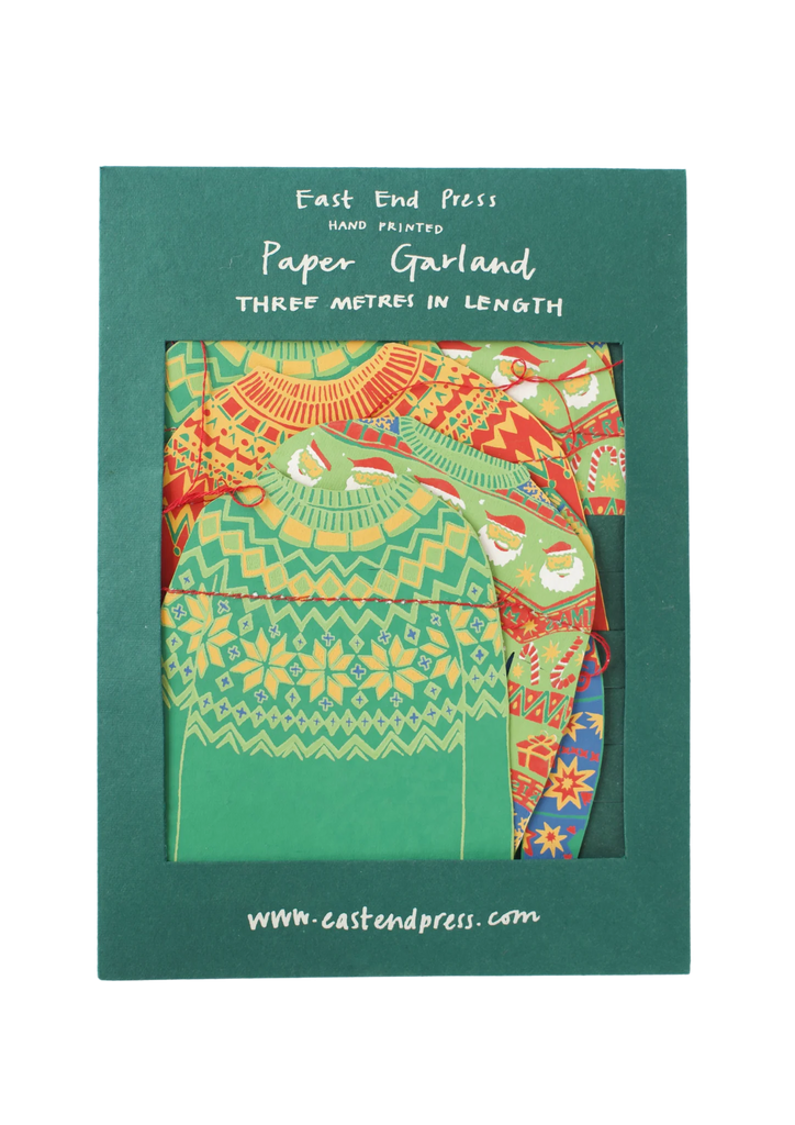 Brave the winter in style! This festive Christmas Jumpers Garland features ten hand-printed, screen-printed paper winter jumpers sewn on strong cotton thread. With three metres of double-sided handmade cotton paper and hanging loops on either end, this garland is ready to hang and bring Christmas cheer to your home!