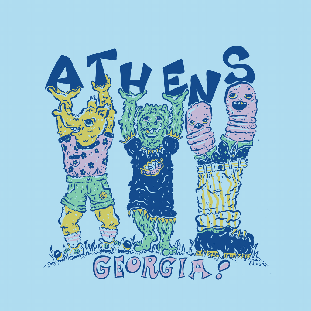 Originally from Denver, Colorado, Elinor Saragoussi is currently based in Athens, Georgia. She works with a variety of mediums, including felt, set design/installation and illustration to create fantastical, colorful works. We love her playful style and whimsical characters so much! Check out the Athens shirt design that she created for us, it's fabulous!