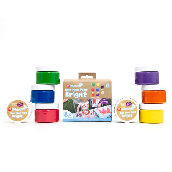 This set includes eight 60mL jars of assorted bright colors of Easy Wash washable paint. Young artists can made a mess with no stress on your end: the paint washes easily from skin and clothing. This set includes green, yellow, red, blue, orange, purple, black and white.