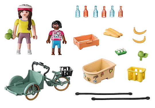 - The 28-piece toy set includes two PLAYMOBIL figures, a cargo bike with interchangeable transport tray, a vegetable box, a drinks crate with bottles and other extras.