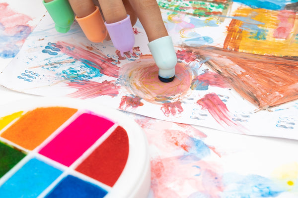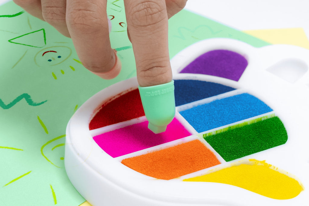 Fingertopz award-winning package design. Includes 8 vibrant colors, a color pallette and a water tray. There's also 8 cool stamp designs and 2 brushes. Fits most kids fingers, from 4 years to 10 years or older! Comfortable soft silicone. Non-toxic!