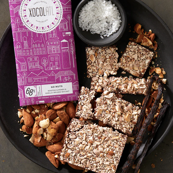 Starting with fine flavor cacao we sourced directly from our farmer partner in the forests of Nicaragua, we added only organic cane sugar and organic cocoa butter to make the purest dark chocolate with a hint of natural fruitiness characteristic of Nicaraguan cacao. We then hand-sprinkled dry-roasted almond pieces to the backs of each bar with a touch of sea salt steeped in aromatic vanilla for a satisfying energy boost in dark chocolate form.