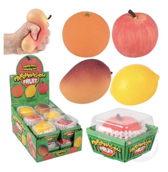 These Marshmallow fruits are great for squeezing and stretching fun. Assorted styles.