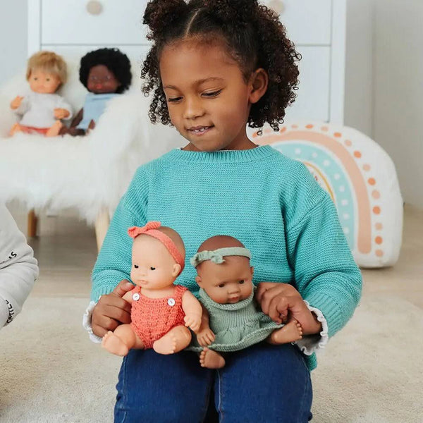The new collection of knitted clothing for 8¼" Miniland Dolls is made of recycled materials. All of them are in natural shades and have a handmade look.