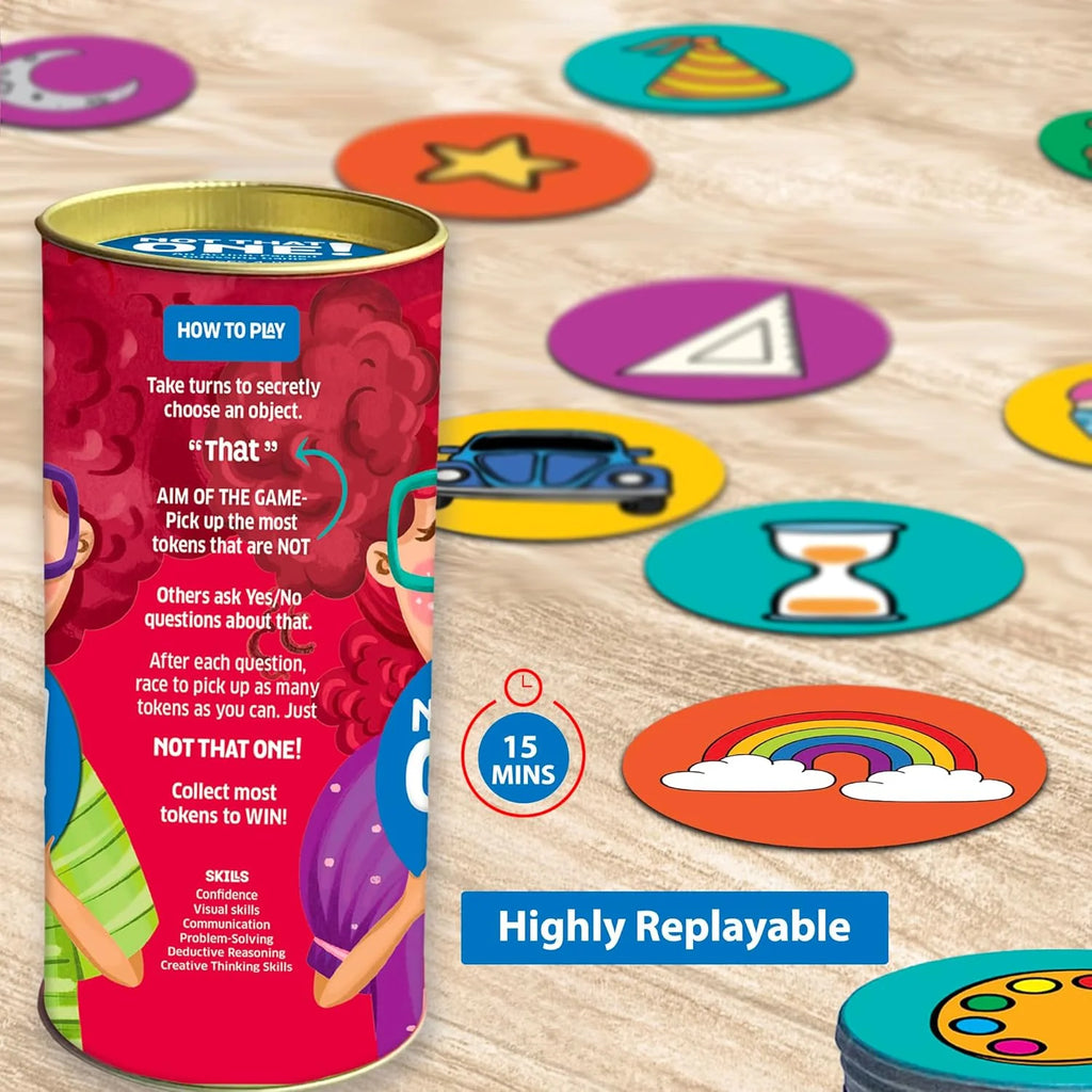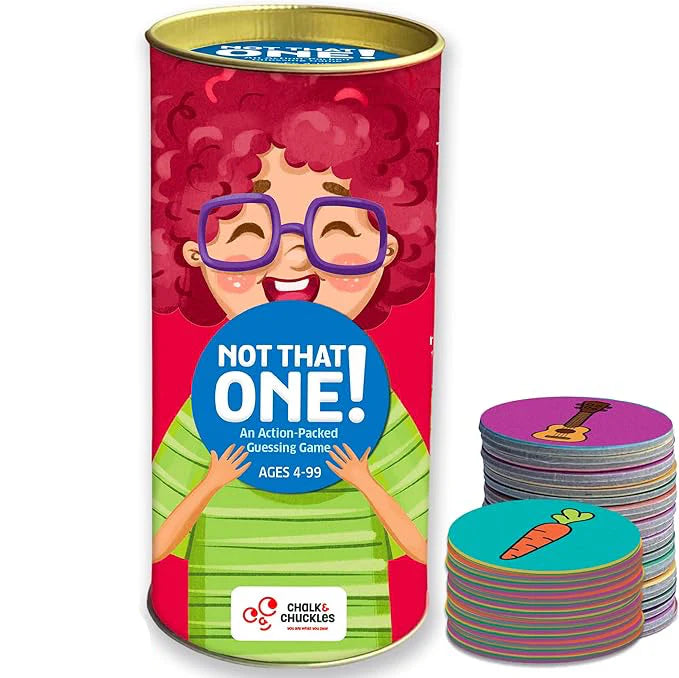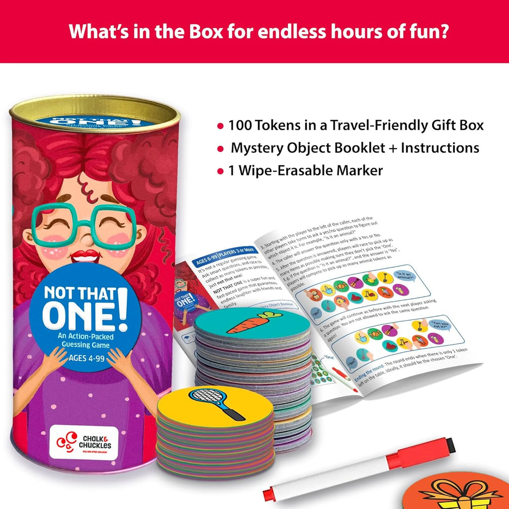 • HOW TO PLAY- Choose a secret Not That One token. Players ask yes/no questions to guess your pick. Race to grab tokens before the round ends, but avoid the forbidden one Is it an animal? No? Grab all the animals Is it edible? Yes? Don't grab food Collect most tokens to win the round.