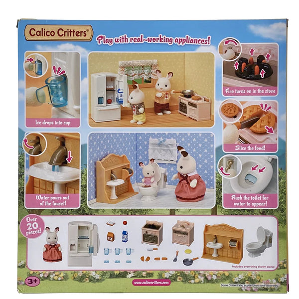 Playful Starter Furniture Set lets you turn the knob on the hob to reveal a flame. Place the apple pie or baguette on the cutting table and cut them with the knife. Place a cup in the fridge ice dispenser to make ice come out. Open the tap over the sink for ""water"" to come out. Pull the toilet handle to ""flush"".