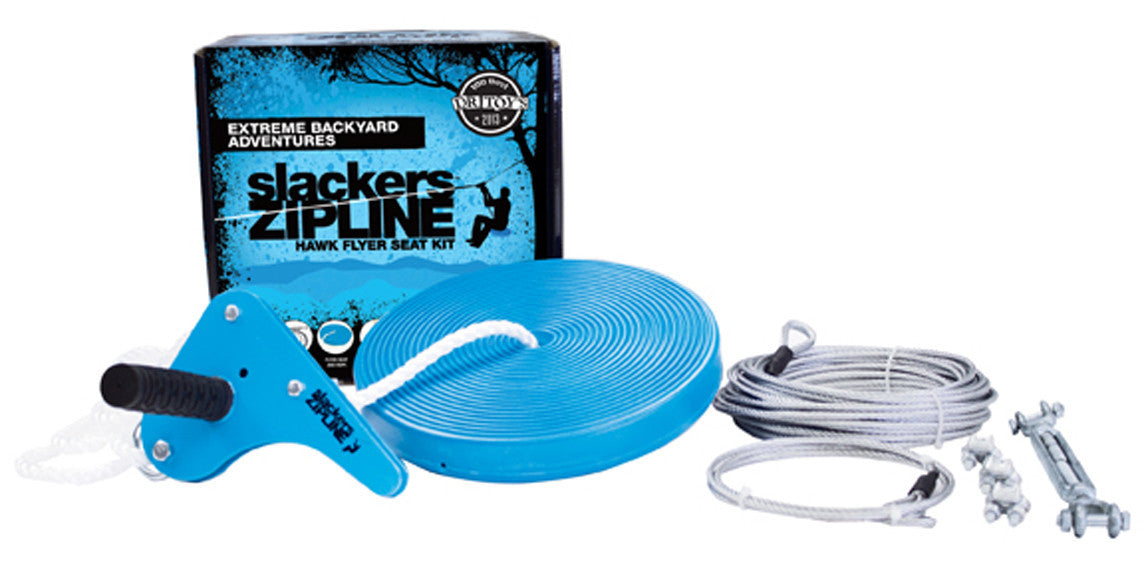 Get ready to FLY through the air with the Slackers Zipline kit! Grab hold of the hand trolley and let your body hang free, or simply attach the adjustable flyer seat for a more supportive ride-- with a 70 ft long cable, this zipline really goes the distance. The PERFECT addition to any outdoor playscape, just in time for Spring and Summer!