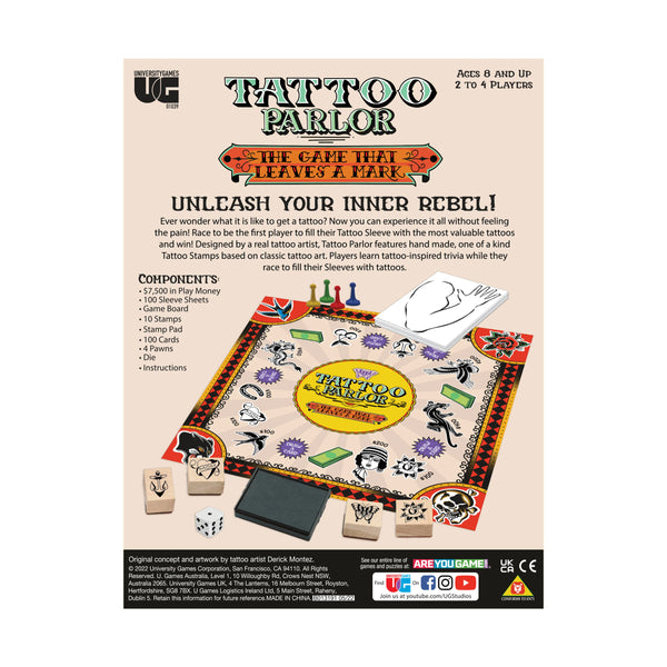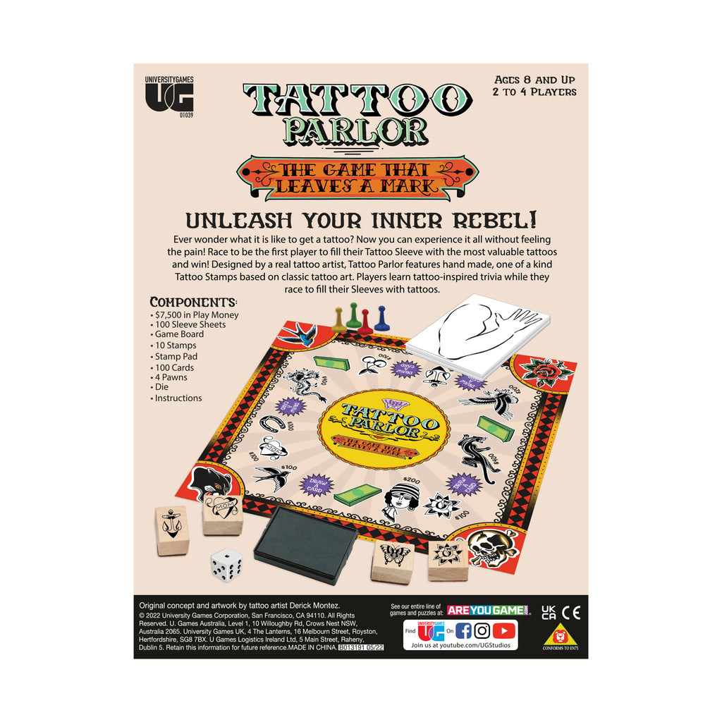 Unleash your inner rebel! Ever wonder what it takes to get a tattoo? Now you can experience it all without feeling the pain! Race to be the first player to fill their Tattoo Sleeve with the most valuable Tattoo Stamps to win!